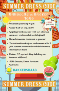 Op basis van een toss zullen er wedstrijdjes gespeeld worden van 15 minuten. Je schrijft je individueel in voor tennis of padel. We houden een barbecue tussen de wedstijden door en dit keer zou het leuk zijn als iedereen super zomers gekleed komt. Ofte wel een summer dress code. Wie binnen Bakkershaag is er creatief en verzint het leukste zomerse outfit?